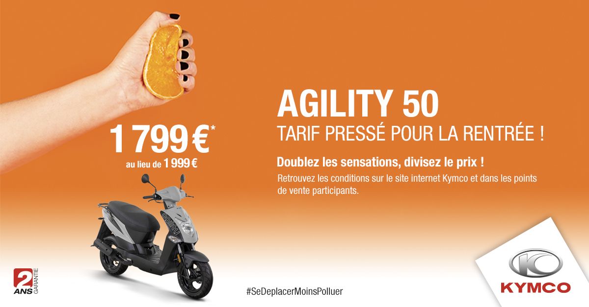 (1) Prix publics conseillés. Offre non-cumulable et limitée du 4 septembre au 31 octobre 2023 dans la limite des stocks disponibles. Offre exceptionnelle de 400€ d'avantages client pouvant être utilisés pour l'achat d'accessoires KYMCO, d'une aide à la reprise ou d'une remise. Tous les coloris sont concernés par cette offre dans la limite des stocks disponibles.